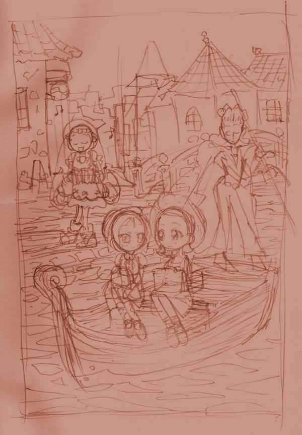 おんぷちゃんのバースディCGを描きたかったのですが、 タイムアウトでラフのみ(;_;)そこで趣向を変えて、 このCGが出来上がるまでをドキュメントでおおくりします〜。 とりあえず、今回は頭に浮かんだイメージをパパッと まとめてみました。次回は線画あたりでしょうか。周囲の 風景や、舟の資料を集めて描くぞ〜って感じです。