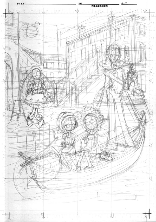 おんぷちゃんのバースディCGを描きたかったのですが、 タイムアウトでラフのみ(;_;)そこで趣向を変えて、 このCGが出来上がるまでをドキュメントでおおくりします〜。 第二段階として、原稿用紙に下描きしてみました〜。 おおまかな構図を写すために、縦横に方眼を描いてコピー したのはいいけど、主人公が小さくなってしまった(汗